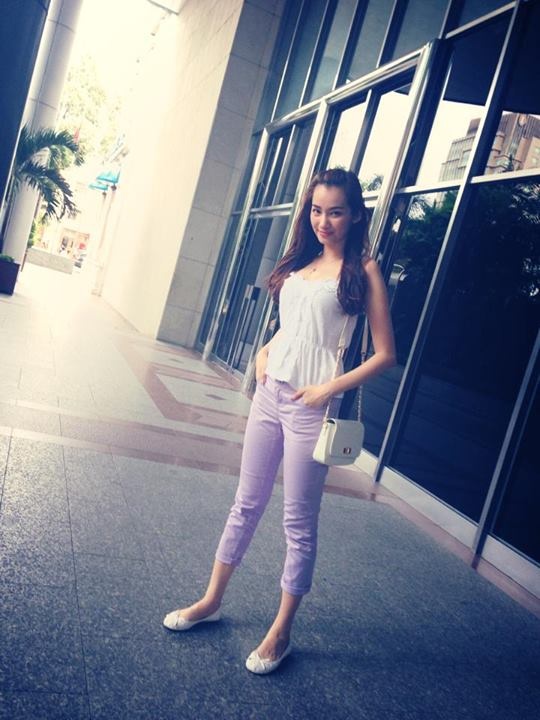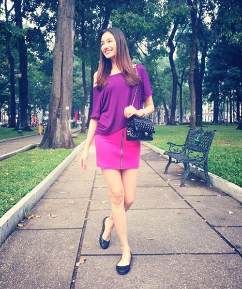 Đôi giày bệt luôn có vị trí quan trọng trong thời trang dạo phố của Trúc Diễm. Cách mix tông hồng và tím cũng là một bí quyết giúp người đẹp ăn gian tuổi.