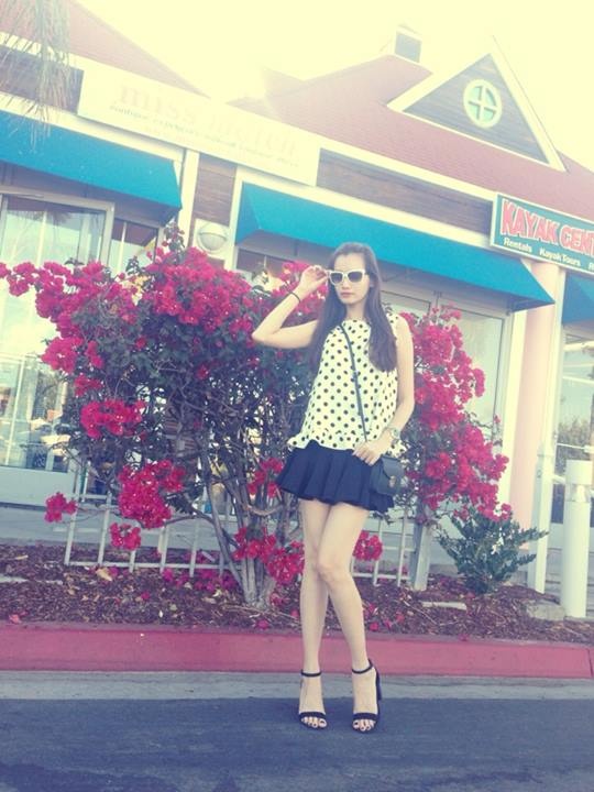Cũng có khi cô như một nữ sinh với sơ mi chấm bi và váy denim xòe.