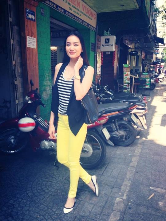 Xuống phố với áo kẻ, gillet và quần skinny vàng nổi bật.