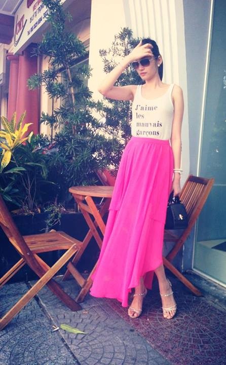 Váy maxi mix kèm áo thun in chữ hợp thời trang.