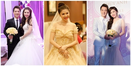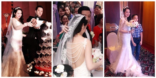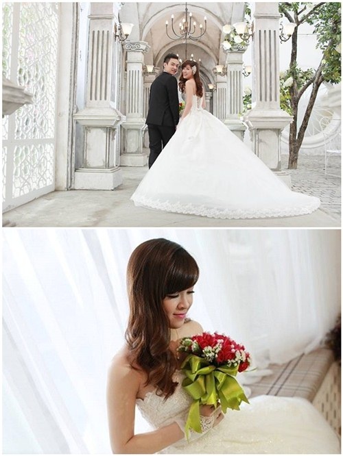 | Tông trang điểm tự nhiên và những kiểu váy xòe bồng bềnh, dịu dàng đã tôn vinh nét đẹp tinh khôi, nhẹ nhàng của Thủy Anh trong ngày cưới. |