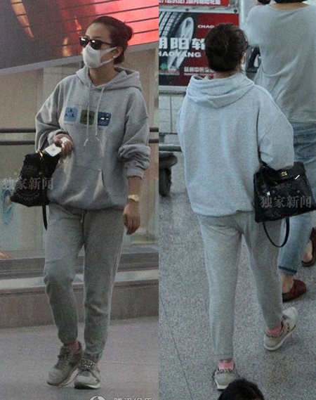 | Không ít lần, Triệu Vy bị bắt gặp mặc trang phục đồ ngủ làm thủ tục xuất cảnh. |