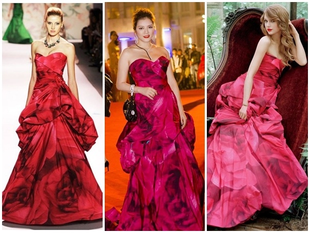 Chiếc váy Monique Llhuillier với thiết kế quây cùng các nếp gấp như những cánh hoa e ấp, phù hợp với những người đẹp vai thon, dáng mảnh như Taylor Swift. Nhưng vòng một đẫy đà và bờ vai tròn lẳn của Lý Nhã Kỳ lại khiến chiếc váy hàng hiệu trở nên nặng nề.