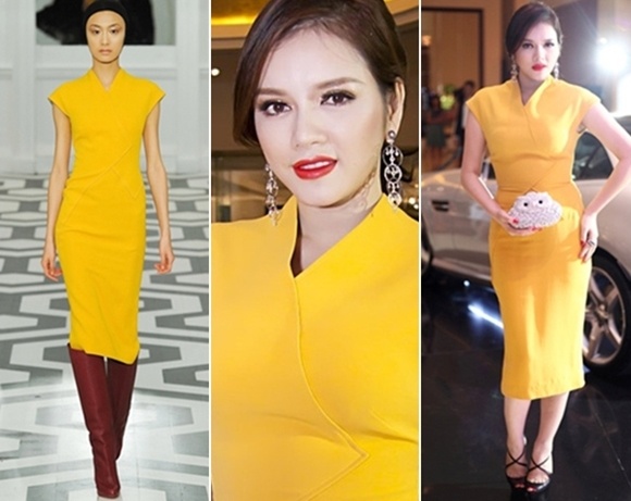 | Diện mẫu váy màu trơn gam vàng hợp xu hướng, hình ảnh của Lý Nhã Kỳ vẫn không được cải thiện bởi thiết kế đã để lộ quá rõ vòng eo kém thon. |