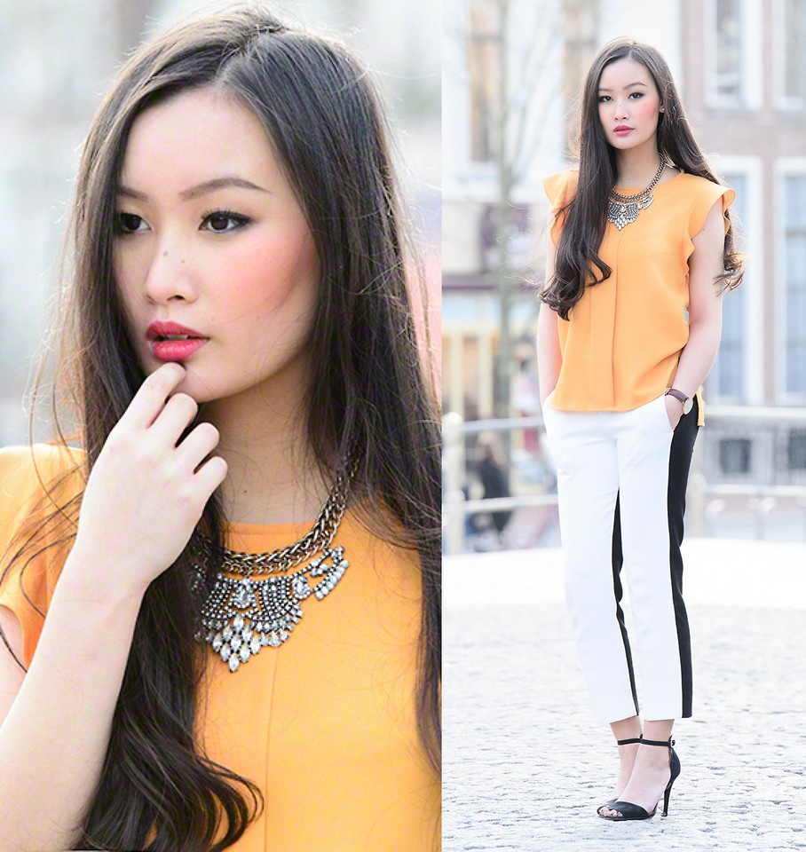 | Chiếc quần trắng phối đen trở nên dịu dàng hơn với cách kết hợp áo voan Mango rực rỡ. |