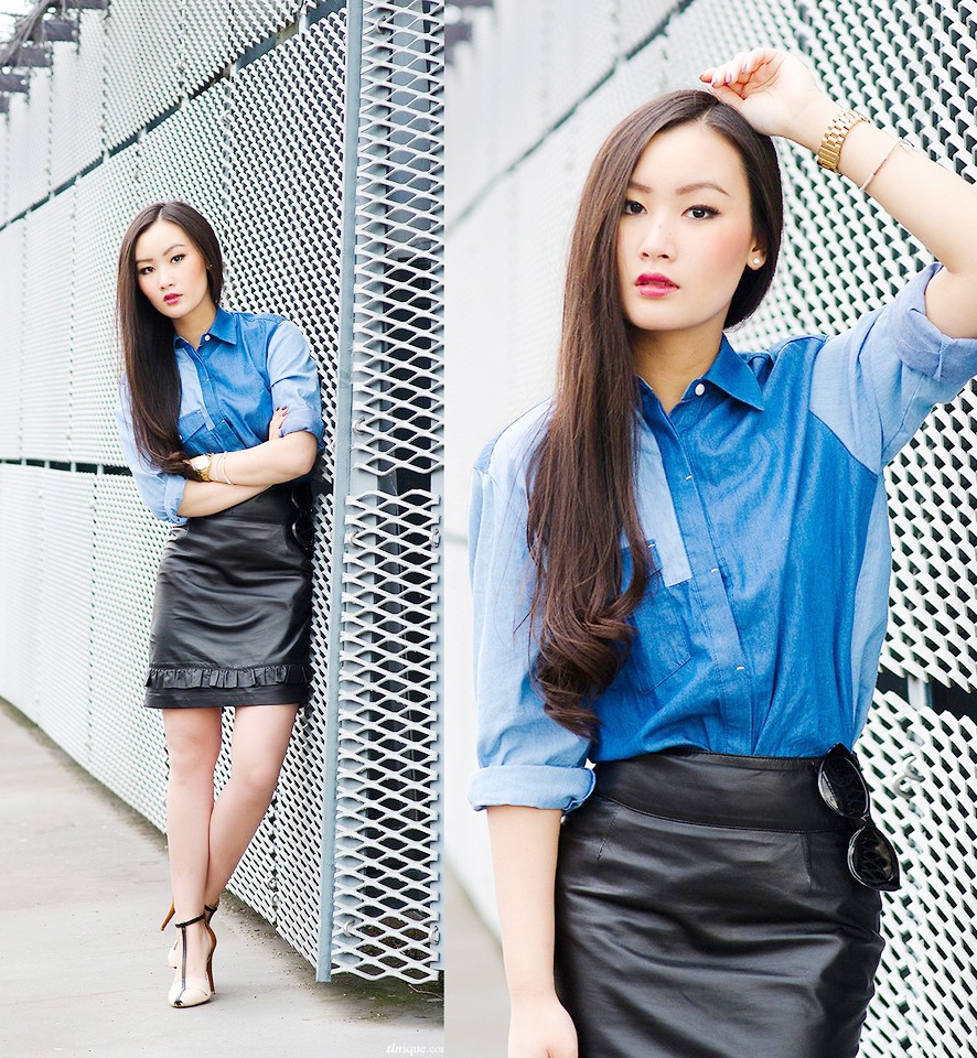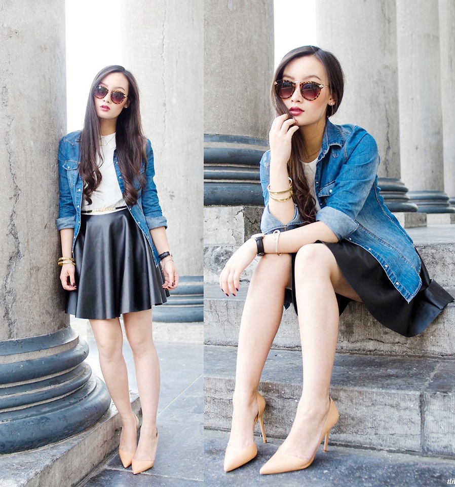 | Một cách kết hợp trẻ trung của cô gái 20 tuổi với áo sơ mi denim và váy da. |