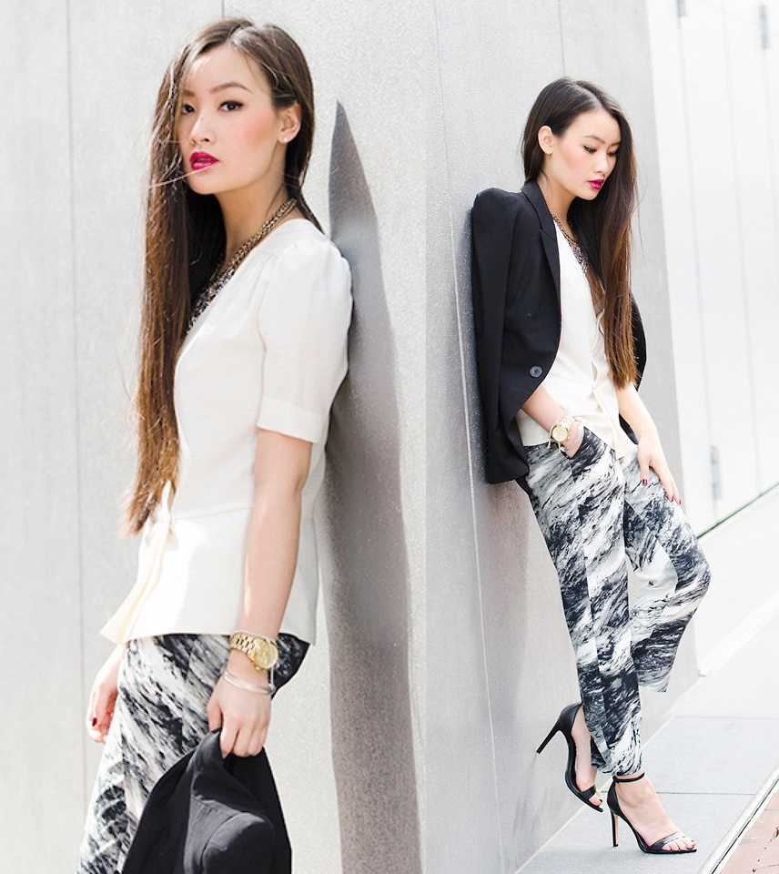 | Quần họa tiết loang màu được tăng điểm nhấn với chiếc blazer đen thanh lịch. |