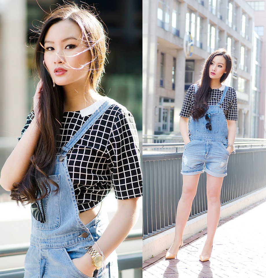 | Cô nàng cũng không bỏ qua xu hướng quần yếm khi diện kèm crop top. |