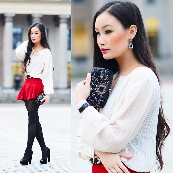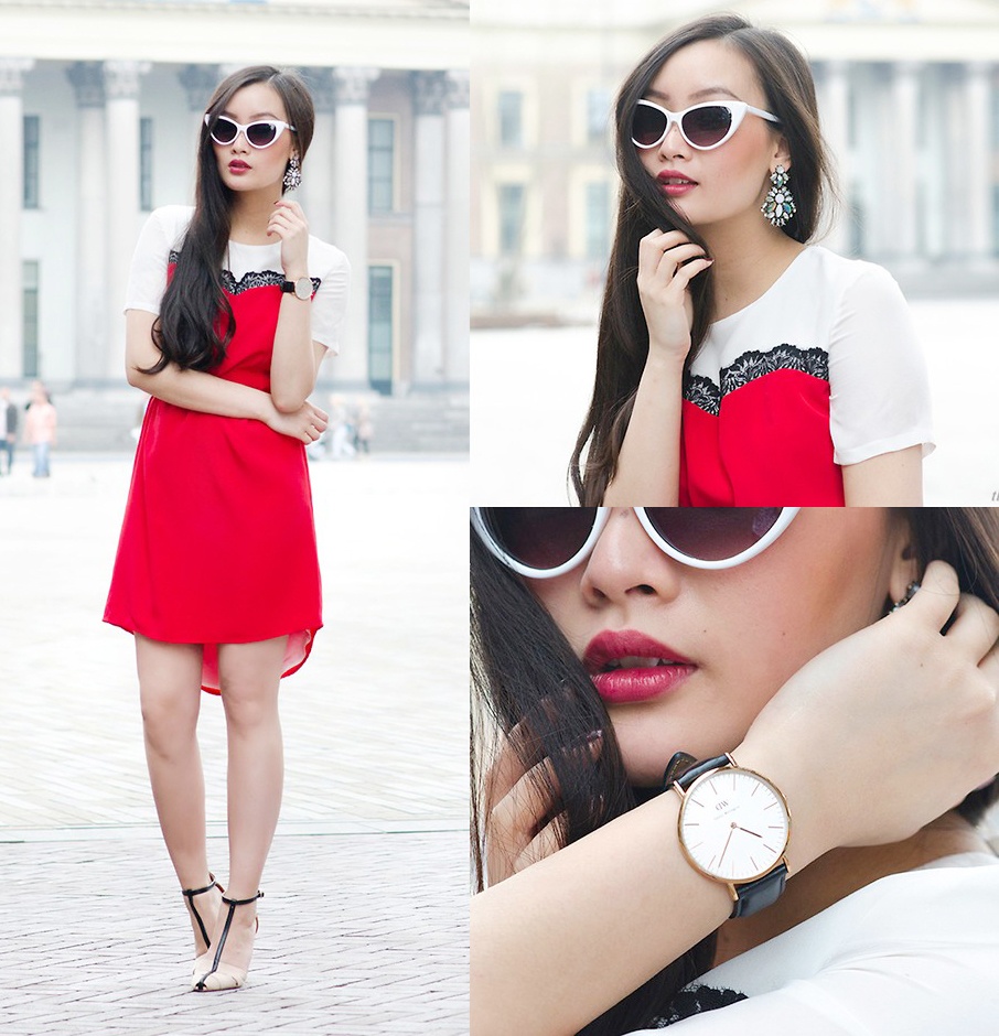 | Đầm dự tiệc sang trọng với tông màu đỏ - trắng được Lê Vi ưa thích. |