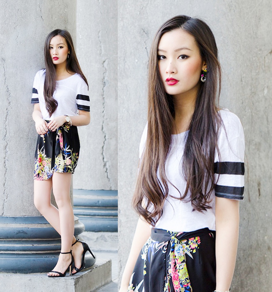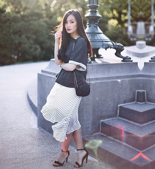| Cách kết hợp rất ngẫu hứng giữa áo suông Zara với váy xòe kẻ đen trắng tạo nên một tổng thể hoàn hảo. |
