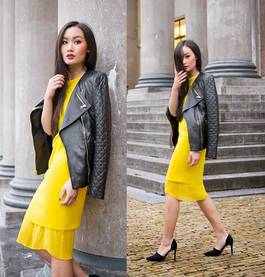 | Phong cách dự tiệc xinh đẹp với đầm vàng Mango và chiếc áo khoác da trẻ trung. |