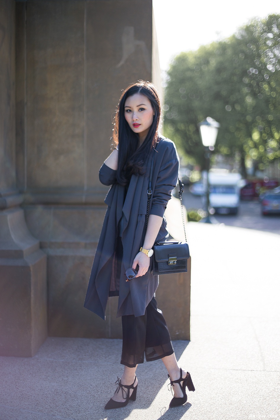 | Phong cách ưa thích cho ngày giao mùa của Lê Vi là chiếc áo trend coat mix kèm quần lửng chất liệu voan mỏng. |