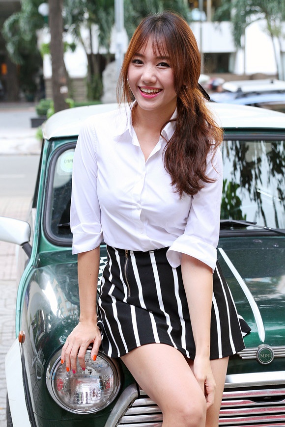 | Chân váy ngắn giúp Hari Won khoe khéo lợi thế đôi chân thon dài. |