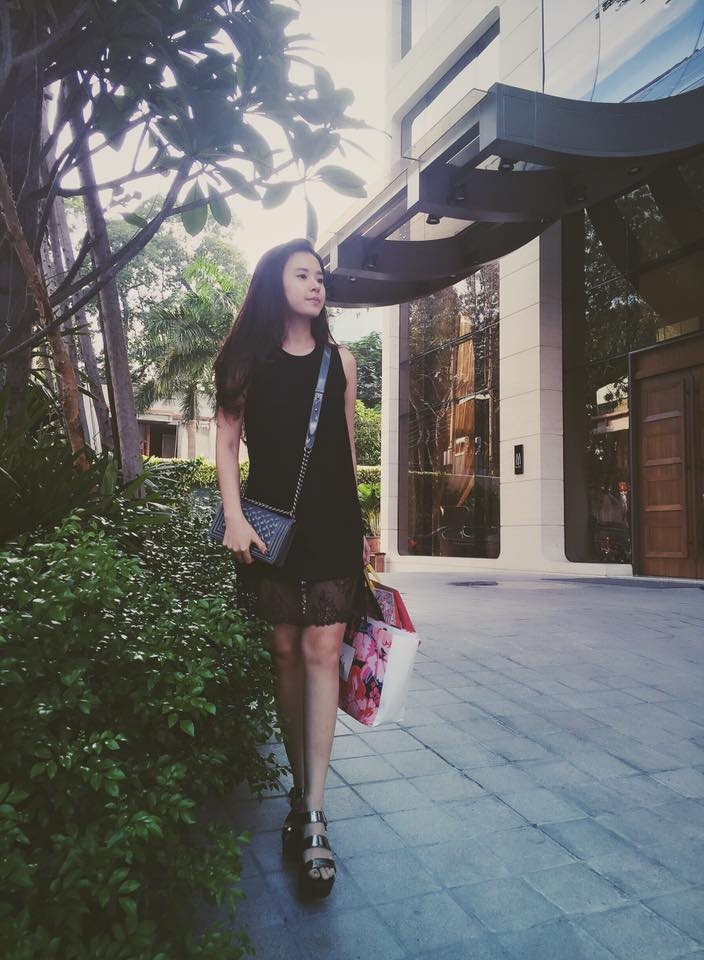 | Tuy chọn váy đen đơn giản nhưng phần chèn vải ren ở chân váy giúp Midu thêm ấn tượng. |