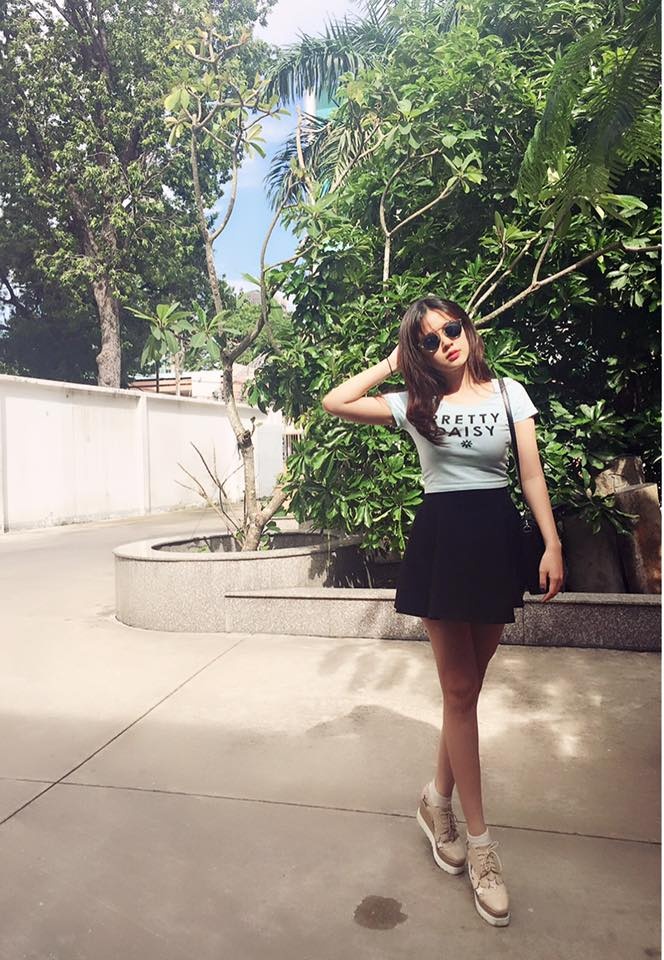 | Chân váy xòe ngắn điệu đà và tôn dáng là style ngọt ngào rất phù hợp với nét đẹp dịu dàng của Midu. |