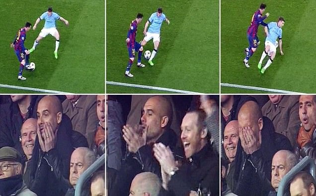 Ngồi trên khán đài, Pep Guardiola liên tục có hành động ngỡ ngàng trước những pha đi bóng của Messi. Vị thuyền trưởng của Bayern không ngừng vỗ tay, thậm chí ôm mặt vì không tin vào pha xâu kim của siêu sao 27 tuổi đối với James Milner ở phút 38.