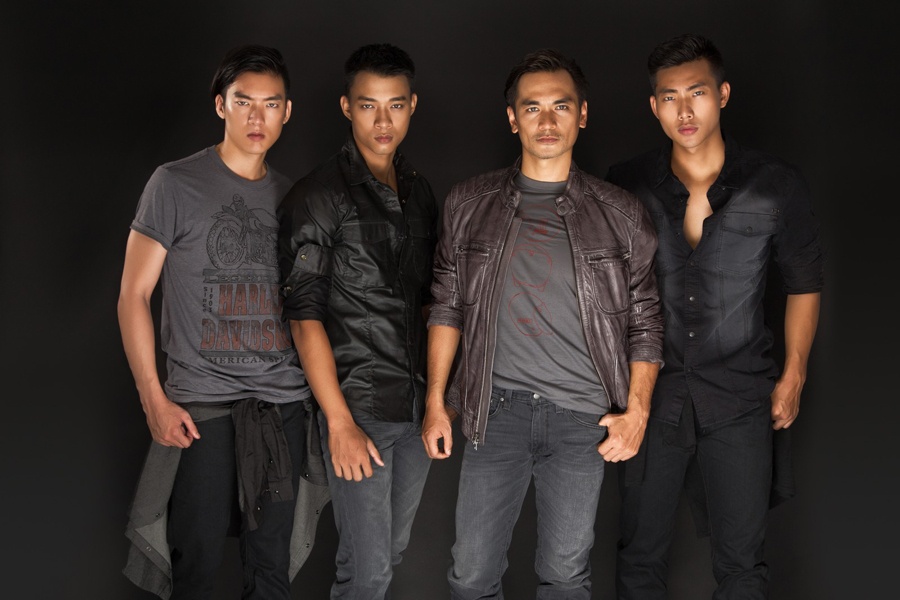 | Cựu giám khảo Vietnam's Next Top Model nổi bật giữa đàn em. Nhóm mẫu nam diện trang phục áo thun, quần jeans tông xám trầm, phong cách hiện đại, khỏe khoắn. |