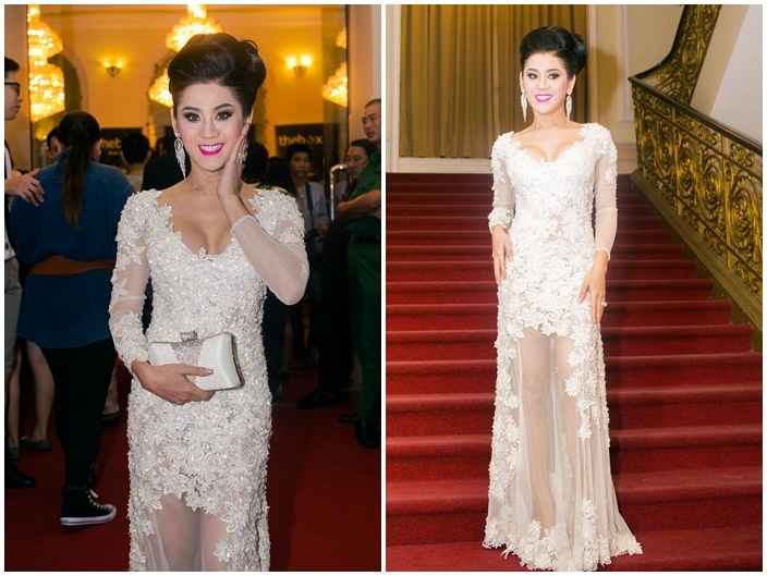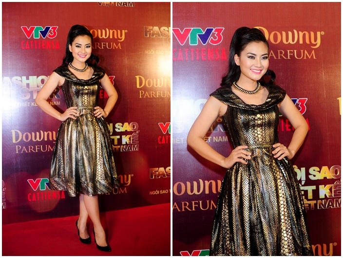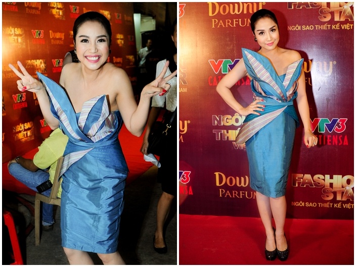 Diễn viên Ngọc Lan diện một thiết kế không mấy hợp mốt. Bộ váy có chất liệu ánh kim rườm rà, xa rời xu hướng thời trang.