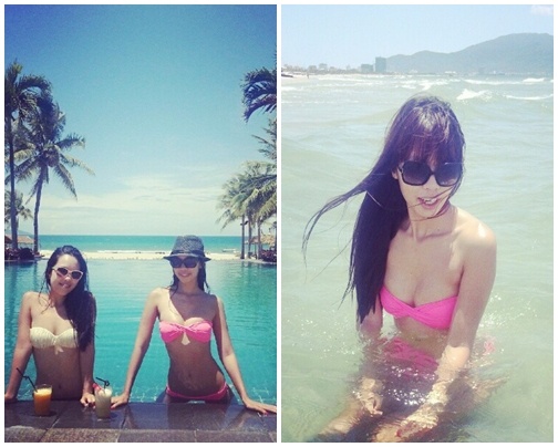 | Sôi động với bikini tông màu hot pink. Trong nhiều kiểu trang phục, Hà Anh chỉ chọn kiểu tóc mái ngang suôn dài. |
