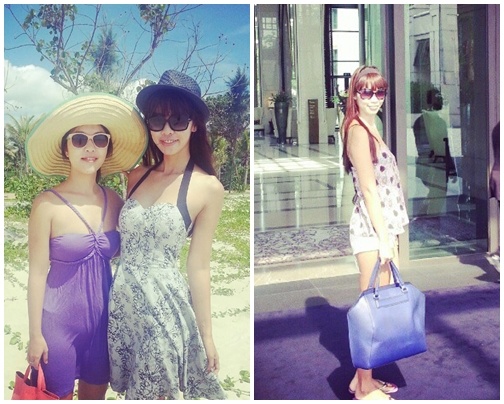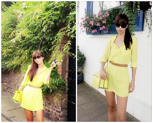 | Tông màu vàng được cô phối cùng túi xách hợp tông. |