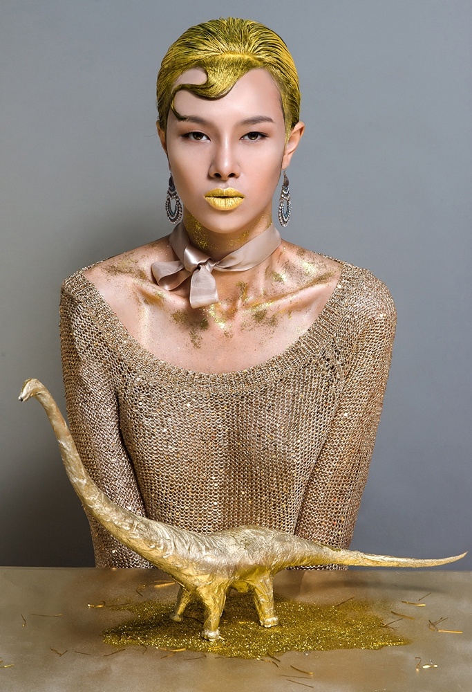 | Lối trang điểm vàng đồng của môi mắt, thậm chí trang phục ton sur ton tạo nên tổng thể thống nhất về màu sắc cho tấm ảnh. |