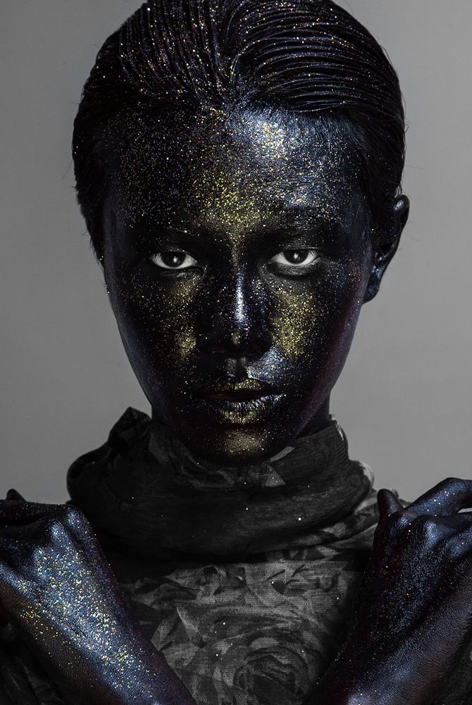 Ý tưởng thú vị mang lại cảm hứng cho toàn ee-kíp thực hiện. Trong ảnh, chân dài Next Top Model trang điểm cá tính với gương mặt "băng giá". Làn da, chân mày, lông mi,... được phủ phấn trắng.