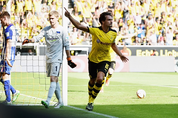 Các cầu thủ Dortmund nhập cuộc thận trọng dù Hertha Berlin không phải đội bóng mạnh. Chủ nhà chơi chậm, chắc ở trung tuyến và chờ đối phương sơ hở để ra đòn. Phút 27, sau cú bấm bóng như đặt của Shinji Kagawa, trung vệ lên tham gia tấn công Mats Hummels băng vào đánh đầu cận thành giúp đội chủ sân Signal-Iduna-Park vươn lên dẫn trước.