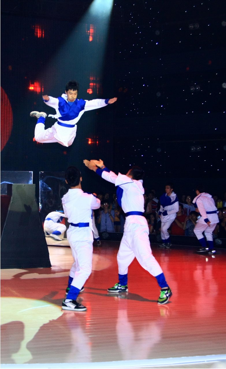 Với đạo cụ là một chiếc bục gỗ to, nhóm Gia đình bong bóng đã dẫn dắt khán giả truyền hình, giám khảo đi vào thế giới của các bộ phim kiếm hiệp bằng những màn nhào lộn trên không cực khó. |