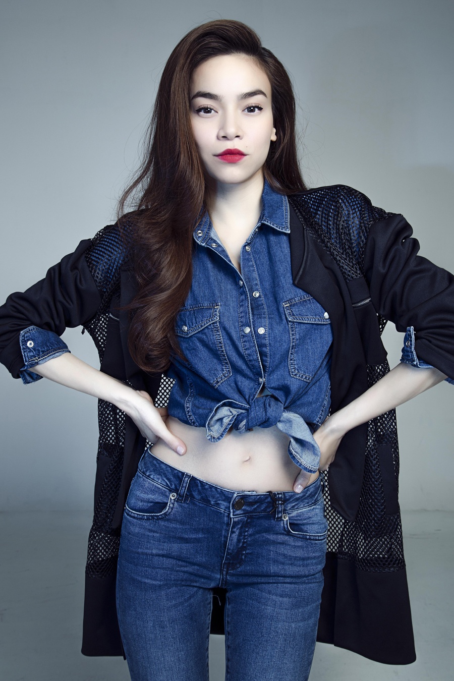 Trong phần chụp ảnh cùng nhóm thí sinh chọn phong cách Denim, Hồ Ngọc Hà thể hiện hình ảnh hiện đại với set trang phục jeans cá tính, áo khoác ngoài phối chất liệu lưới hợp xu hướng. Chân dài đình đám làng nhạc Việt còn cho thấy nét khỏe khoắn với mốt buộc vạt, khoe vòng eo thon gọn.