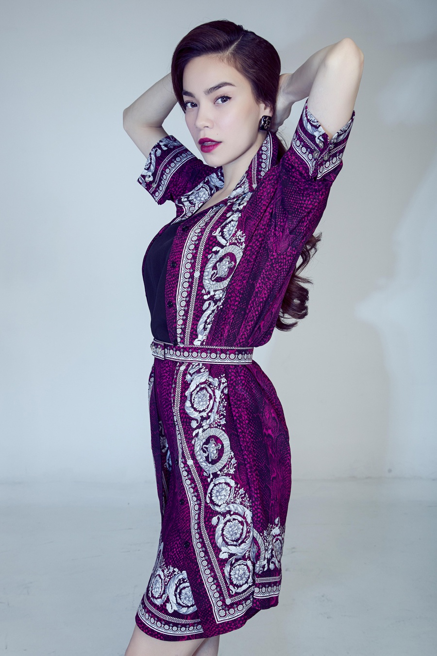 Với phong cách Print on Print, Hồ Ngọc Hà tinh tế với gam màu tím trầm, làm nổi bật họa tiết in, tạo nguồn cảm hứng về sắc màu khi tạo dáng thể hiện hình ảnh mới. Phần trang điểm và kiểu tóc của bà mẹ một con cũng rất ăn nhập. Bờ môi tím đồng màu trang phục rất ấn tượng.