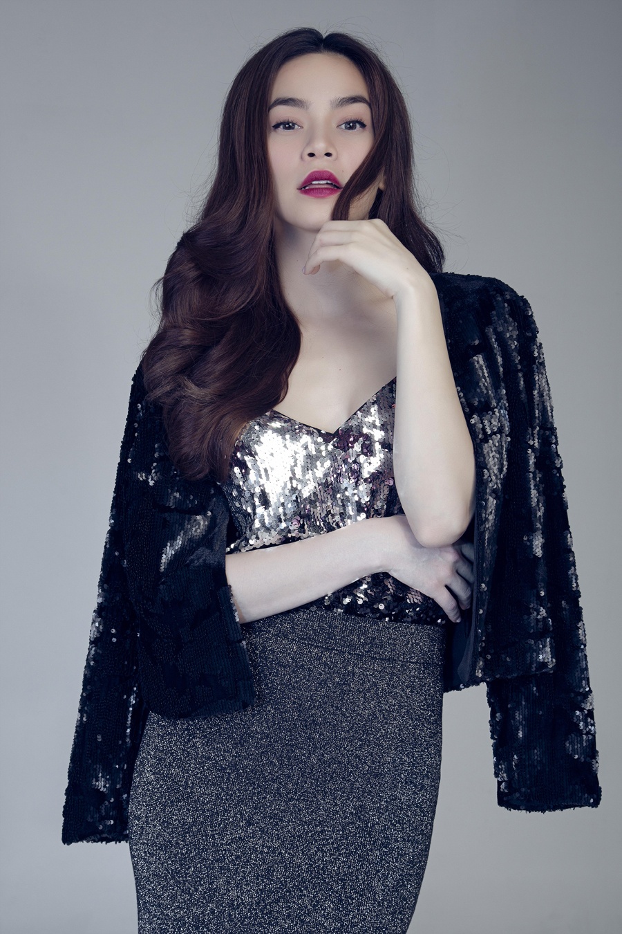 Với phong cách ánh kim, Hồ Ngọc Hà chọn cách thể hiện sang trọng và quý phái. Áo hai dây hợp xu hướng mix ăn ý cùng chân váy bút chì, áo khoác đính sequin. Tất cả đều được thống nhất về màu sắc, chất liệu.