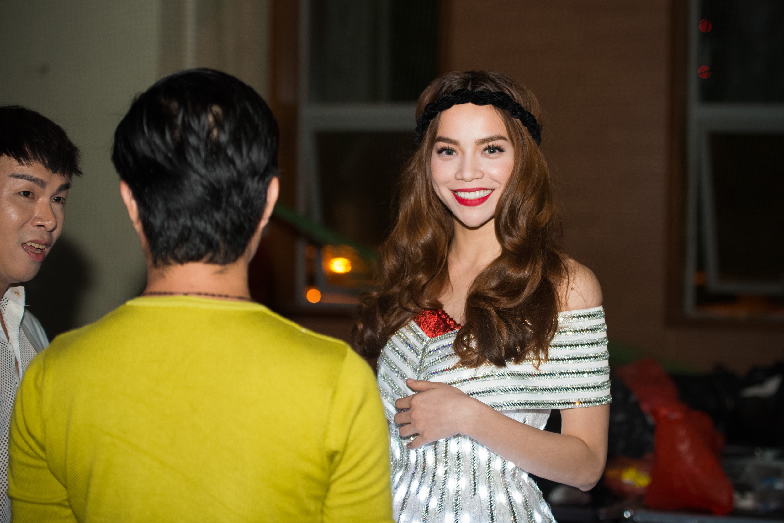 | Thời gian gần đây, Hồ Ngọc Hà thường xuyên có mặt ở Hà Nội để tham gia các đêm nhạc, sự kiện giải trí... Cô vui vẻ trò chuyện cùng vài người bạn trước khi bước ra sân khấu. |