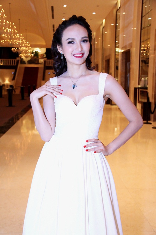 | Bộ đầm trắng đơn giản về màu sắc và họa tiết đưa Ngọc Diễm vào danh sách sao mặc tinh tế của tuần. Thiết kế không quá lộng lẫy không chỉ mang lại nét trẻ trung, duyên dáng cho hoa hậu mà còn khoe khéo vai trần gợi cảm, điểm nhấn là sợi đây đeo nhỏ rất thanh lịch. |