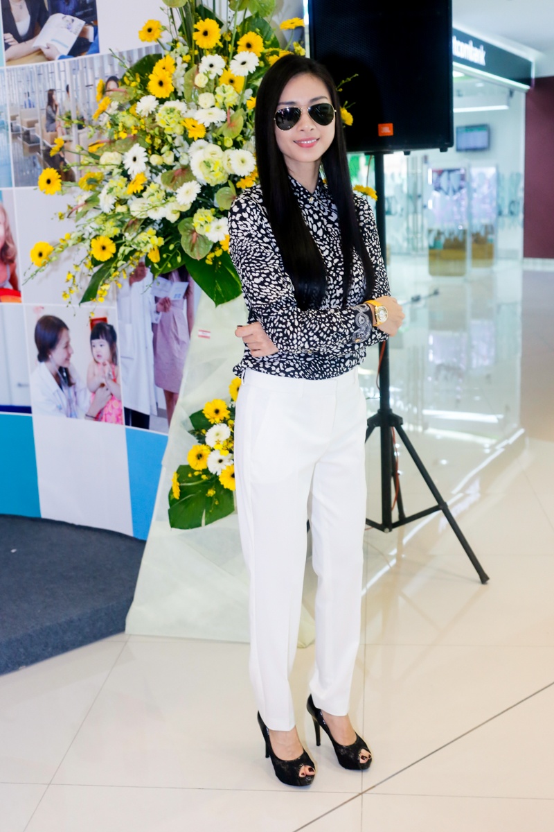 | Ngô Thanh Vân cũng lịch lãm, kín đáo với quần tây trắng, áo sơ mi họa tiết trắng đen. |