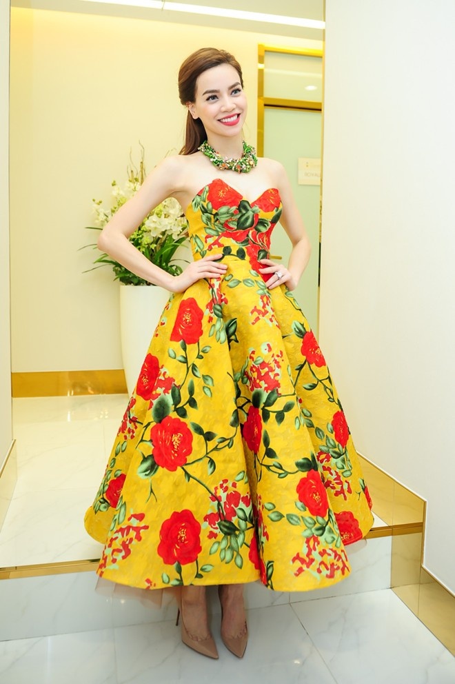 Góp mặt tại sự kiện cuối tuần, Hồ Ngọc Hà thu hút chú ý với trang phục phong cách cổ điển, họa tiết hoa nhiều màu bắt mắt. Thiết kế đầm xòe còn giúp nữ ca sĩ khéo khoe vai trần quyến rũ. Tông trang điểm nhẹ nhàng và phụ kiện phối ăn nhập đưa nữ hoàng giải trí trở thành ngôi sao mặc đẹp nhất tuần qua. Ảnh: Nguyễn Bá Ngọc.