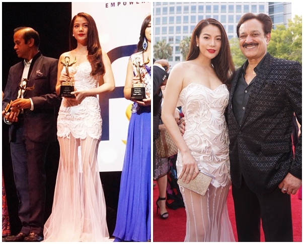 Trong tuần, Trương Ngọc Ánh sang Mỹ nhận giải thưởng Nữ diễn viên xuất sắc (phim Hương Ga) tại Liên hoan phim Thế giới. "Cô Dần" nổi bật ở sự kiện quốc tế nhờ đầm đuôi cá xuyên thấu, cúp ngực sexy. Bộ cánh được giới chuyên môn trong nước đánh giá cao. Ảnh: NVCC.