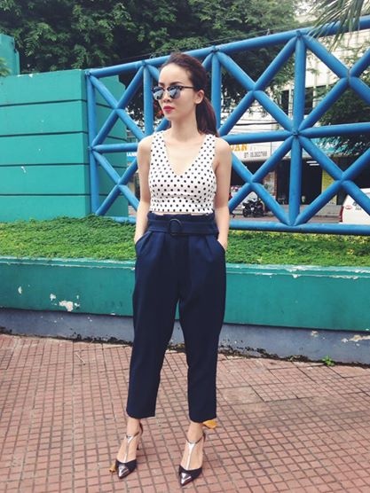 | Đối lập với "Én em", Yến Trang chọn áo chấm bi và quần capri hiện đại, thắt lưng cổ điển làm điểm nhấn, giày cao gót mũi nhọn kiểu cách. |