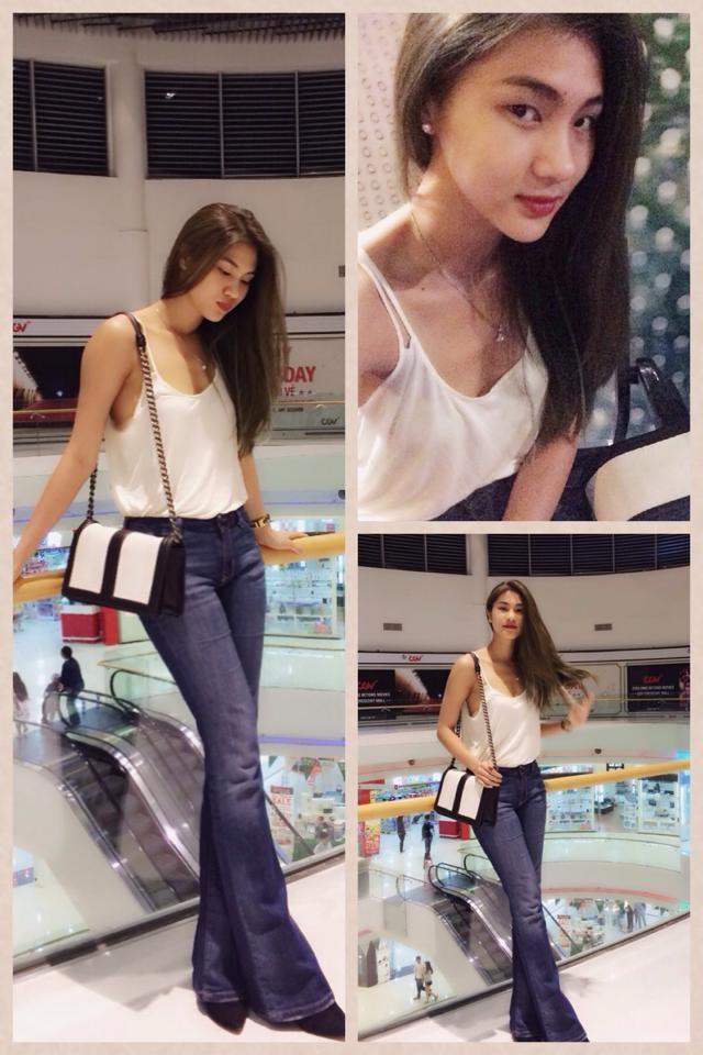 | Người mẫu Linh Chi chọn trang phục tối giản màu sắc khi xuống phố, đồng thời bắt nhịp với xu hướng chung với áo hai dây và quần jeans ống côn hiện đại. |