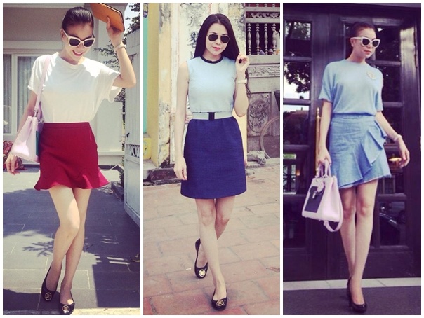 | Người đẹp Trà Ngọc Hằng chứng tỏ gu thời trang thanh lịch với những gam màu trung tinsn, nền nã. Cô diện áo thun đơn giản, chân váy bút chì, váy loe, kèm giày đế bệt khi xuống phố, gặp gỡ bạn bè, đối tác công việc. |