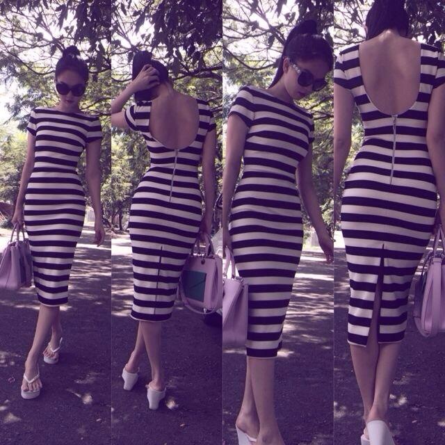 | "Nữ hoàng nội y" Ngọc Trinh trung thành với trang phục ôm dáng khoe lợi thế đường cong. Trên con phố gần nhà, cô khoe hình ảnh mới với bộ váy sọc kẻ hiện đại, năng động, đi kèm là dép xỏ ngón cao gót và túi Dior tông màu hồng nền nã. |