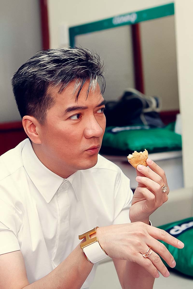 | Ông hoàng nhạc Việt tranh thủ ăn tạm trước khi bắt đầu công việc. |
