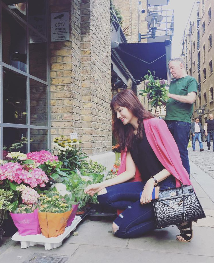 | Trúc Diễm có chuyến du lịch cùng ông xã tại châu Âu. Trong ảnh, chân dài diện bộ cánh thanh lịch gồm: áo thun, quần jeans rách và vest hồng. |