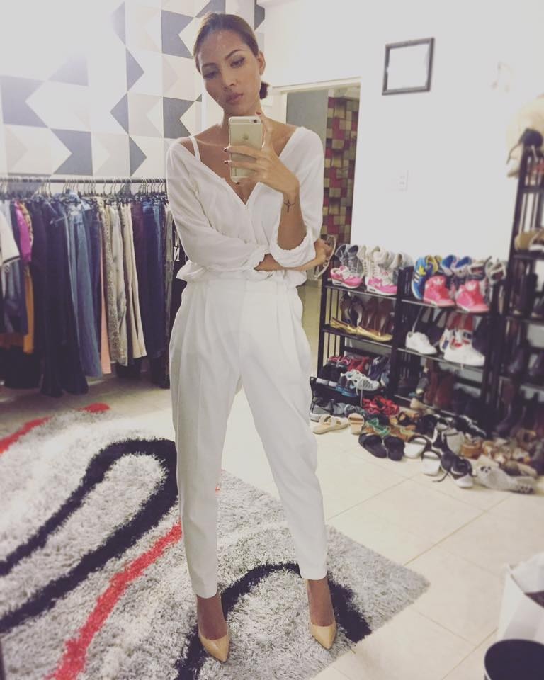 | Trước khi ra phố, Minh Triệu ghi lại hình ảnh set đồ tông trắng mà cô ưng ý. Thiết kế áo trễ vai giúp người mặc thêm phần cuốn hút. |
