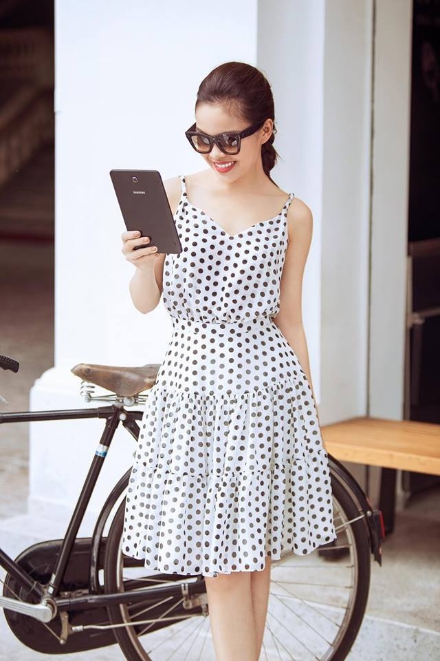 | Giang Hồng Ngọc nhẹ nhàng trong bộ váy hai dây, họa tiết chấm bi nhã nhặn. |