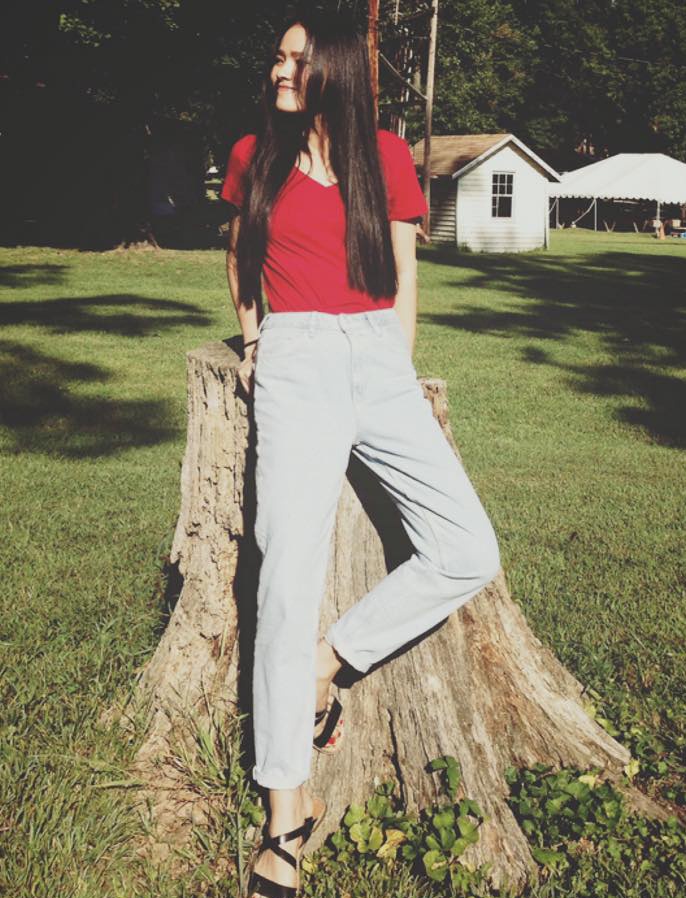 | Tại Mỹ, Tuyết Lan diện trang phục đơn giản, áo thun màu đỏ và quần âu trắng khi thả bộ trong vườn. |