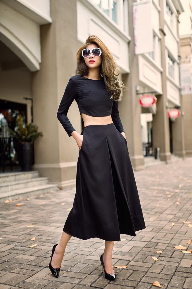 | Người mẫu Kim Dung diện "cây đen" thanh lịch khi tản bộ trên đường phố Sài thành. Vòng eo thon gọn được phô diễn đúng cách với mốt áo crop-top. |