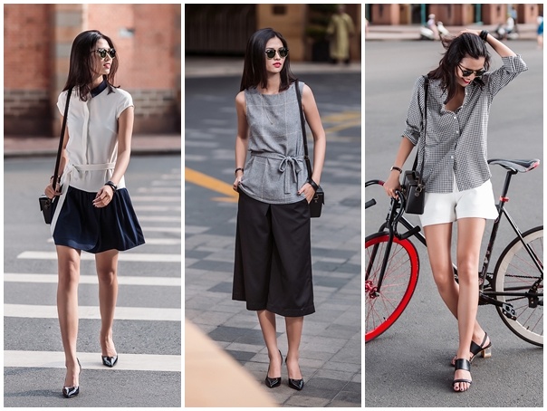| Hoàng Thùy ăn vận cá tính khi dạo phố trong tuần. Áo pyjama phối cùng quần shorts sọc kẻ hiện đại. |