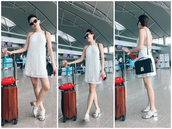 | Thời trang sân bay của Tóc Tiên được các tín đồ thời trang yêu thích. Nữ ca sĩ diện mốt váy ren cổ áo yếm khi đáp chuyến bay sang Mỹ dự sự kiện. |
