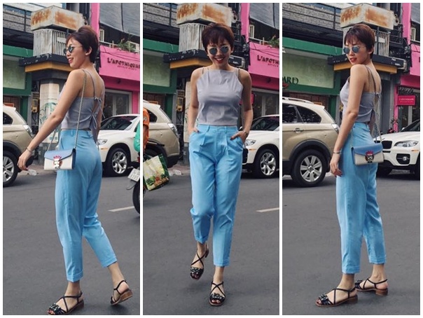 | Một dịp khác trong tuần, giọng ca Ngày mai phối hợp tông màu xám và xanh da trời hài hòa. Phụ kiện túi xách nhỏ và giày sandals tiện lợi. |