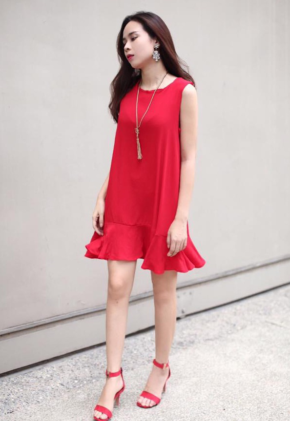 | Lưu Hương Giang duy trì hình tượng thanh lịch với mốt váy suông đỏ, giày sandals cao gót đồng màu giúp set đồ thêm hoàn hảo. |